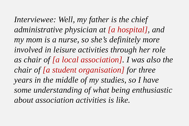 It is often claimed that qualitative data cannot be anonymised. It is indeed particularly challenging to anonymise video or audio data, but FSD provides guidance for anonymising textual data, as such data can be anonymised. Texts may include transcriptions of interviews or writings produced by individuals for research purposes.