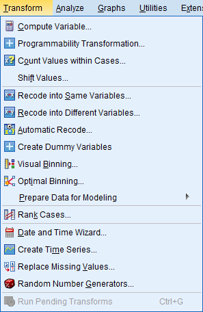 Extensions-valikko sisältää SPSS:n liitännäisiä. Näitä ei käsitellä tässä tarkemmin. Lisätietoja saa klikkaamalla pudotusvalikosta haluttua kohtaa.