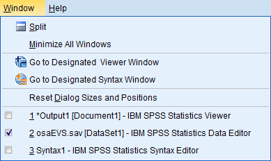 Aktiivisen ikkunan valinta. Vastaa ikkunan valintaa Windowsin tehtäväpalkista, (kuten muissakin Windows-ohjelmissa). Split jakaa ikkunan osiin (ei käytettävissä Output-ikkunassa). Minimize All Windows pienentää kaikki avoimet SPSS-ikkunat ruudulta tehtäväpalkkiin.