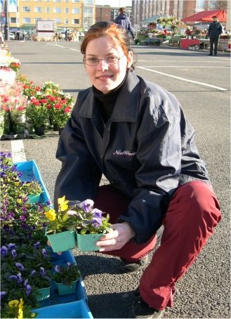 Kuvassa orvokkeja esittelee Suvi Numminen Tampereen Tammelantorilla.